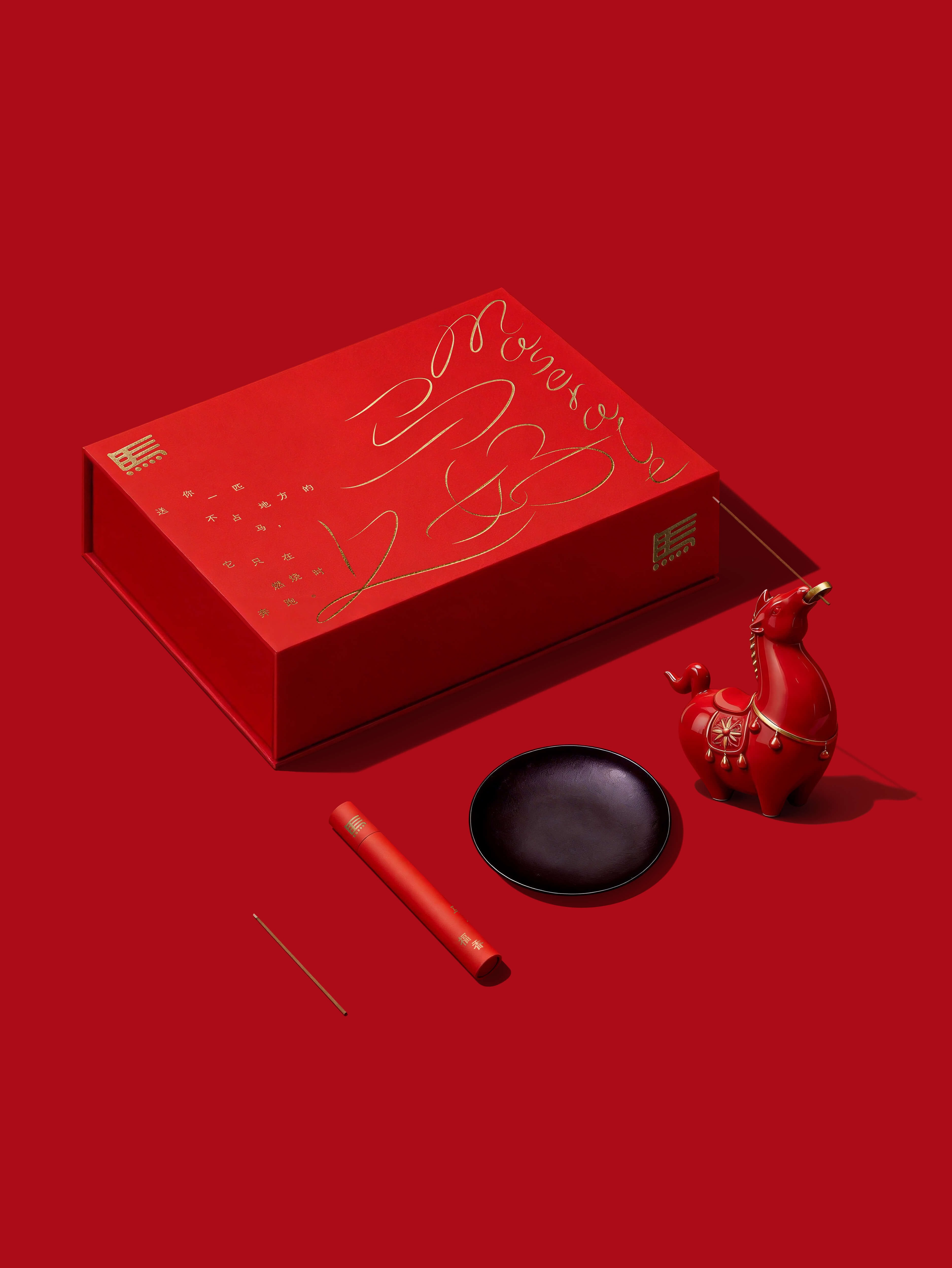 以汉字为魂,烟迹为形——取名为“马上好”,命名兼顾趣味谐音、文化深度与现代传播感,让“马”从传统生肖转化为可互动、可共鸣的香气符号。设计追求“可读的香气”,红色的纸张之上文字布局自由散落,如烟迹随风无定。有的笔画拉长成游丝,恰似线香点燃后漂浮的味道。当消费者打开礼盒,盒面的烟与燃香的烟遥相呼应:一重凝固于纸,一重流动于空,两缕烟迹,同一声“马上好”。