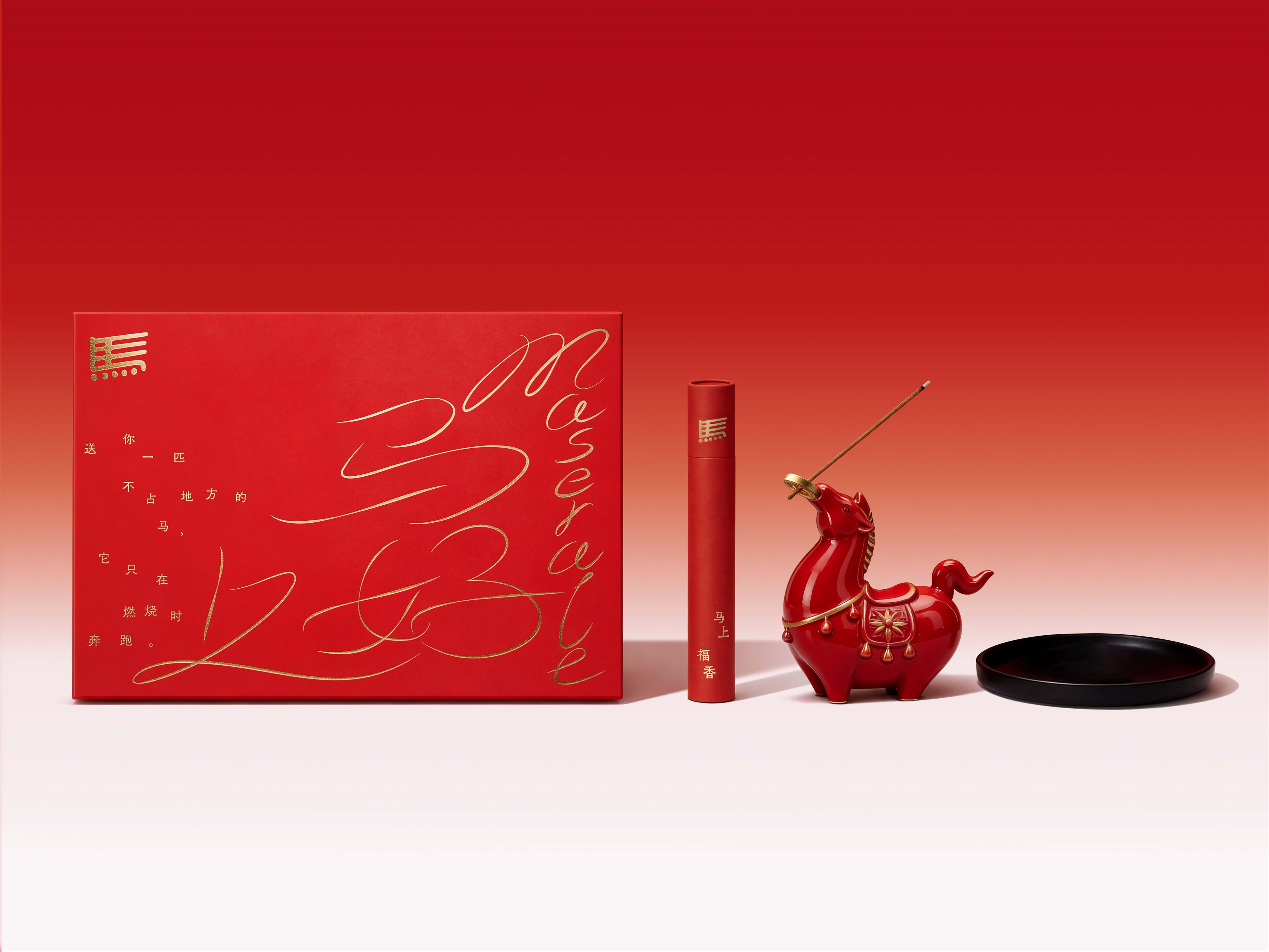 以汉字为魂,烟迹为形——取名为“马上好”,命名兼顾趣味谐音、文化深度与现代传播感,让“马”从传统生肖转化为可互动、可共鸣的香气符号。设计追求“可读的香气”,红色的纸张之上文字布局自由散落,如烟迹随风无定。有的笔画拉长成游丝,恰似线香点燃后漂浮的味道。当消费者打开礼盒,盒面的烟与燃香的烟遥相呼应:一重凝固于纸,一重流动于空,两缕烟迹,同一声“马上好”。