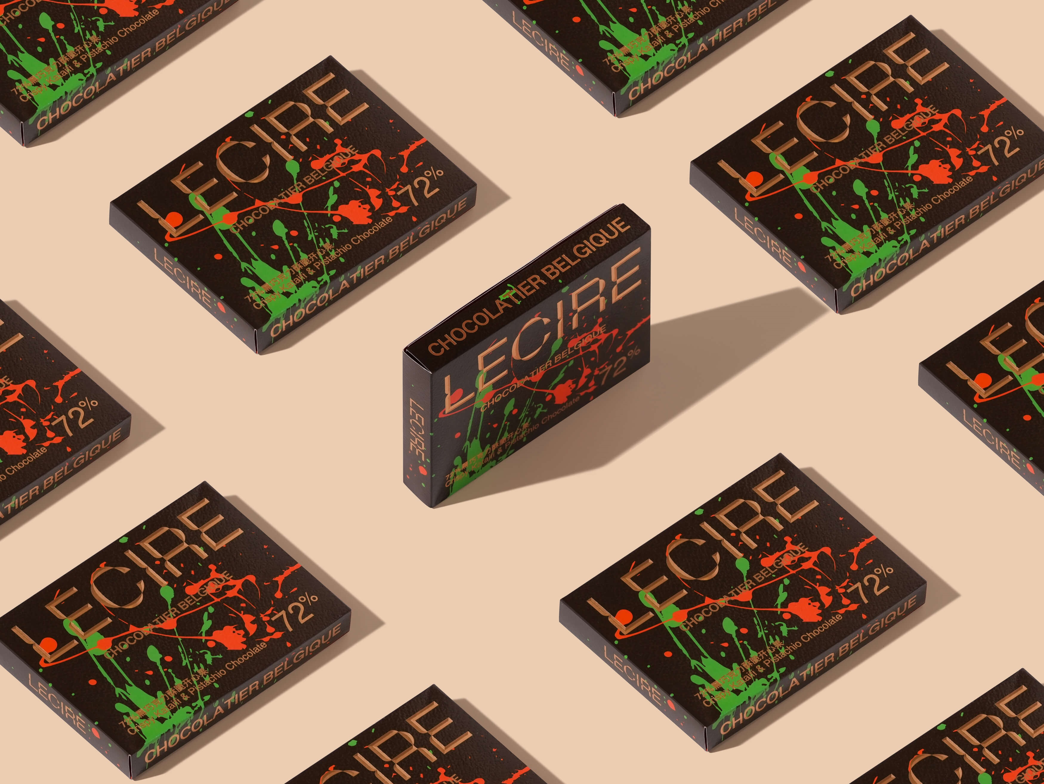 LECIRE“迪拜巧克力”的包装设计,由一张纸折叠而成的包装盒,摒弃了任何的粘口,既环保又节能高效,旨在打破传统巧克力包装过于隆重、奢华、拘谨的印象。